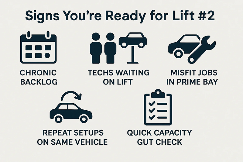 A consistently packed schedule, with vehicles sitting idle and overtime becoming routine, clearly signals that your single lift can no longer meet demand.