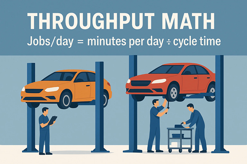 Think of your shop's capacity as repair orders (ROs) completed per day. The formula is: Daily ROs = Total Available Minutes / Average Cycle Time per RO. Cycle time includes the actual repair, setup, repositioning, and waiting.