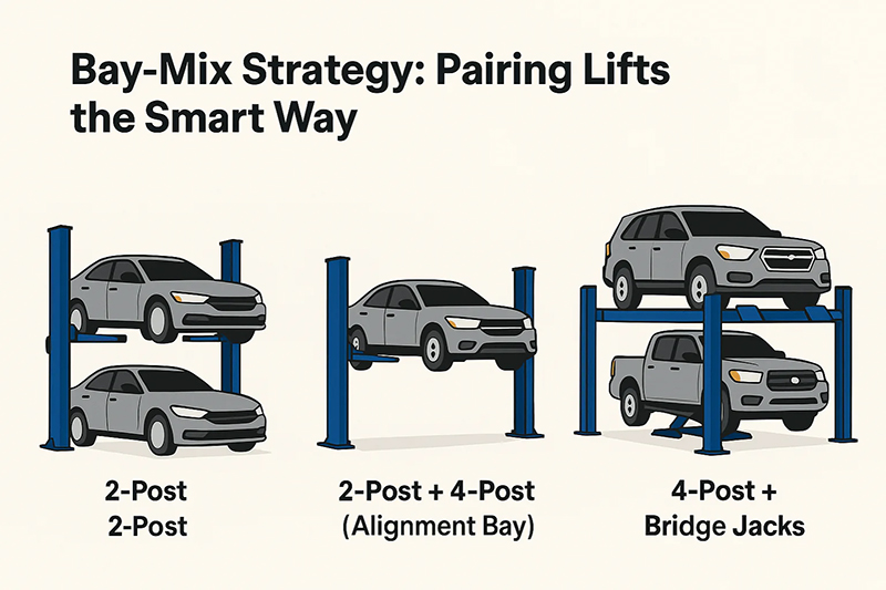 - Task-Specific Tools: Pairing a two-post lift (ideal for tire and suspension work) with a four-post lift (perfect for alignments and inspections) drastically reduces setup time.