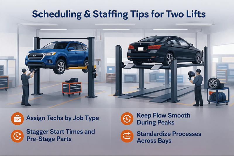 Does a vehicle need to be lifted for a tire rotation in the morning, only to be repositioned later for a brake inspection? This inefficiency is a major time-waster. With two lifts, you can assign the rotation to Lift A and keep Lift B ready for the subsequent inspection, eliminating unnecessary handling.