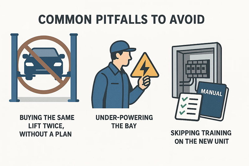 - Power Supply: Most two-post lifts need a dedicated 208-240V circuit. Never use an extension cord. Heavier models may require 3-phase power. Have a qualified electrician confirm your panel's capacity.